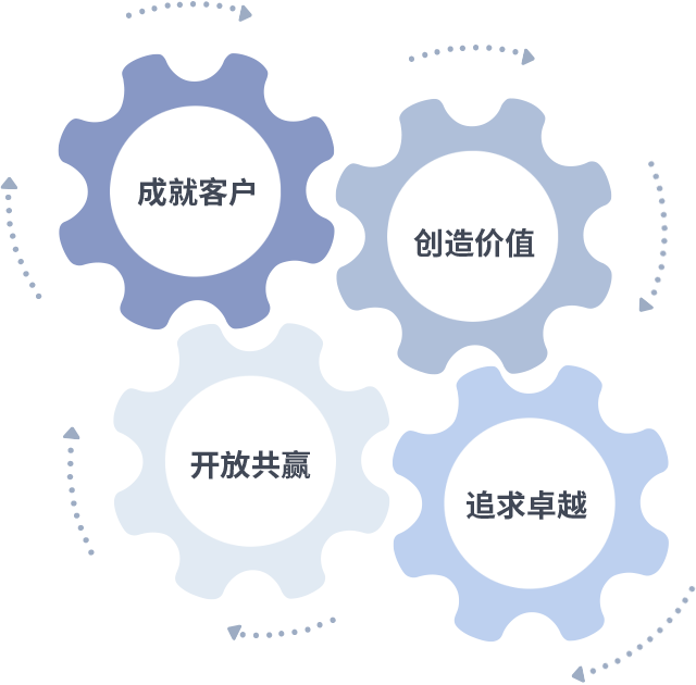 成就客户是一切决策的出发点,,创造价值是衡量所有工作的标准,,,追求卓越是我们做事做人的态度,,,,开放共赢是我们的格局也是最终的结果。。价值观的齿轮环环相扣,,推动着组织里的每个人不断向前。。